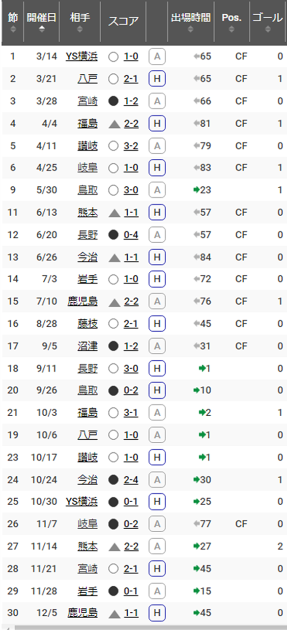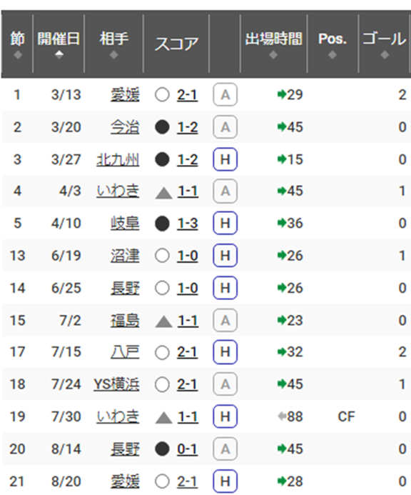 今シーズンも第19節いわき戦以外は途中出場。30分前後で2点を挙げている試合もありいわゆる「ジョーカー」的存在です。