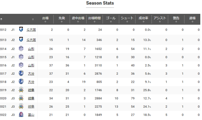 下図はフットボールラボから川西選手の各シーズンのスタッツです。
