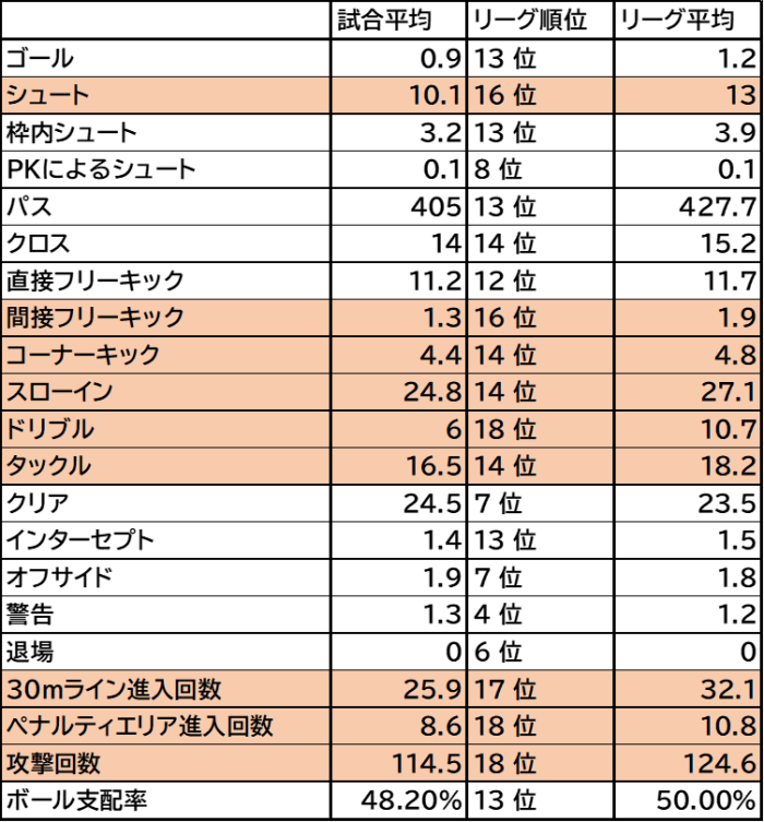 「シュート」、「ドリブル」、「30mライン進入」、「ペナルティエリア進入」、「攻撃回数」など攻撃に関するスタッツが下位になっています。