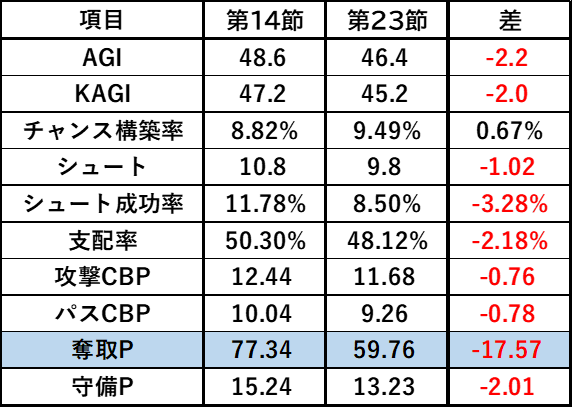 このことから守備が下がり気味になり、そこから奪えず受け身の試合展開になっていると考えます。