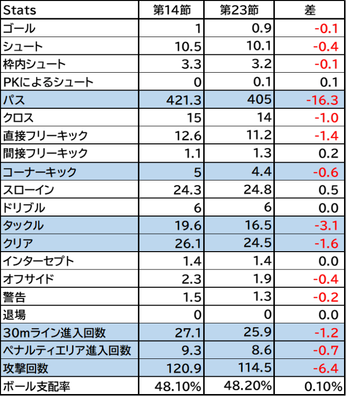 全体的に下がっているのがよくわかりますが、青の部分の先ほども下位になっていた「30mライン進入」、「ペナルティエリア進入」、「攻撃回数」の他にも、さらに「パス」や「タックル」、「クリア」の守備の項目でも下がっています。