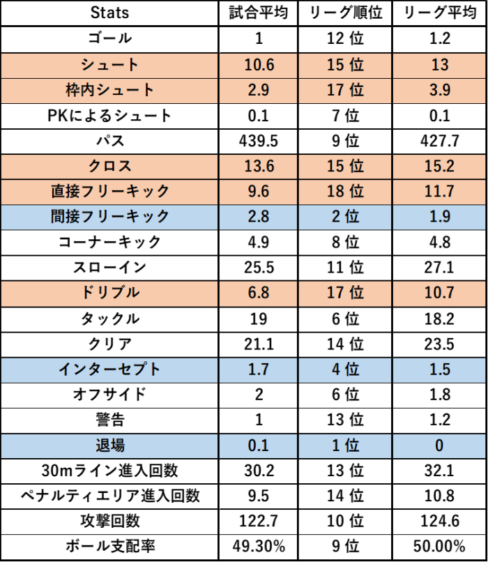 フットボールラボからチームのスタッツですが「シュート」、「クロス」、「ドリブル」などが低くなっています。