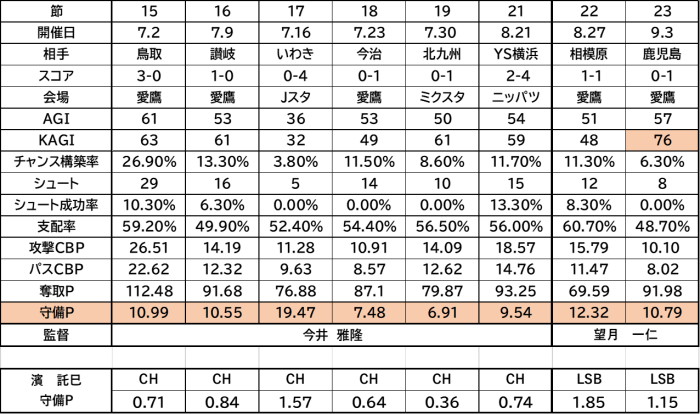 前節の鹿児島戦後のコメントでは「トレーニングの中で高い位置からいく、中盤でいく、ゴール前の守備など守備の狙いをかなり練習してきました。」とありKAGIは今シーズン最高の76となっています。