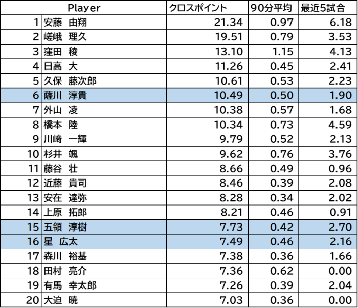 プレイヤー別のクロスのチャンスビルディングポイントでは薩川選手、五領選手、星選手がベスト20に名前が挙がっています。