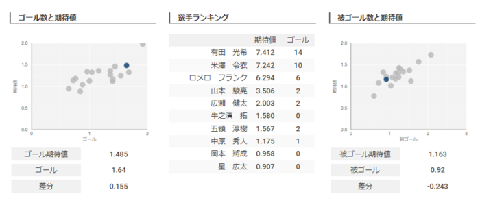 有田選手、米澤選手のゴールが期待値を大きく上回っています。