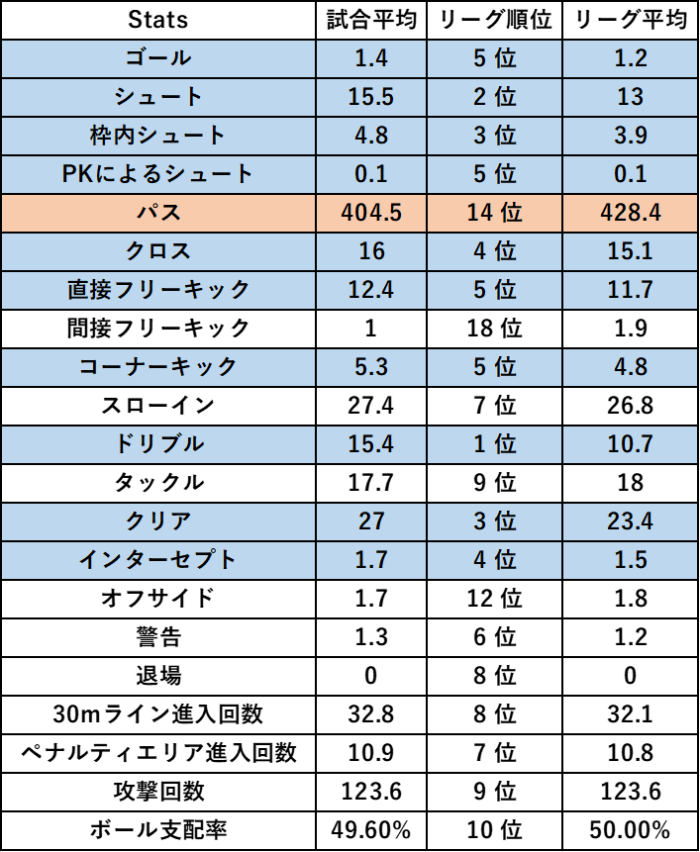 現在6位ということもあり、「パス」項目以外は攻守ともリーグ内で上位の項目が多くあります。