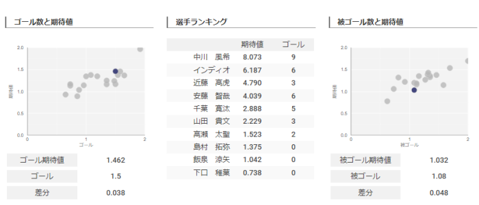 選手ランキングでは途中加入の千葉選手が期待値2.8に対し5ゴールを挙げています。