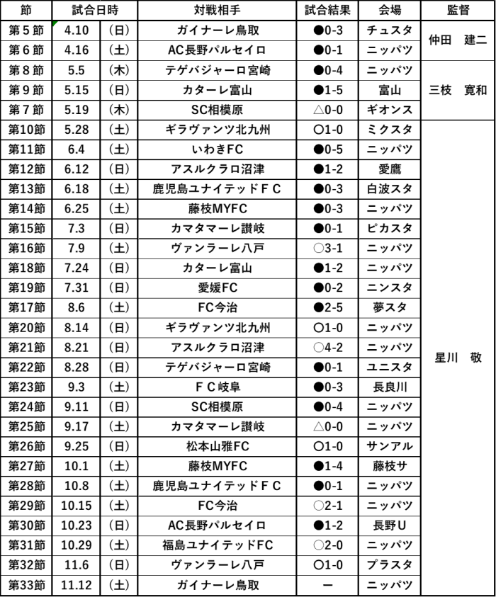 なかなか初勝利が出来ず仲田監督が休養、解任。第6節終了後に3試合三枝コーチが指揮を執り、その後第10節から星川監督が指揮を執っています。5連敗はあるものの現在2連勝中です。