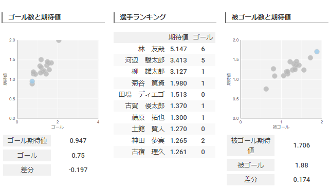 またゴール期待値とゴールでは河辺選手が期待値3.4に対し5ゴール。また表に載っていませんが途中加入のロイスティネッリ選手は期待値1.25に対し2ゴールと結果を残しています(フットボールラボの方質問に丁寧に答えていただきありがとうございます)。