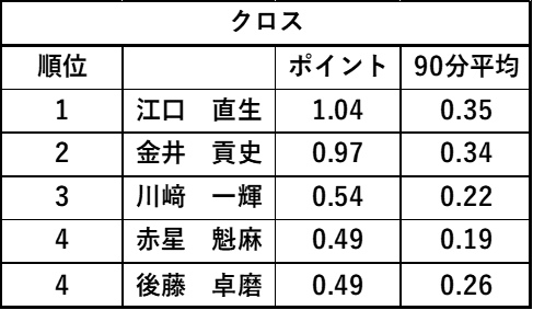 またフットボールラボからクロスのチャンスビルディングポイントでは右サイドの金井、川崎選手が高くなっています。