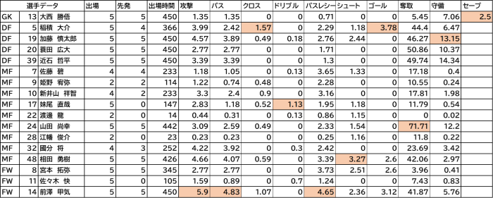 またこちらもフットボールラボから選手の各スタッツを表にしました。