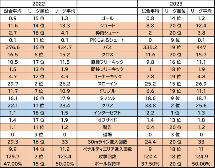 そして下図はフットボールラボから昨シーズンと今シーズンのスタッツの比較です。