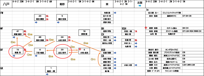 前半はシュート0本でしたが、後半惜しいシーンもあり切り札の小澤選手、田村選手を生かすため大きな変更は無いと考えます。考えられる事としては後半最後で行ったような石井選手を左SBに入れ左サイドを1列づつ前に出すようなポジション変更もあるかもしれません。