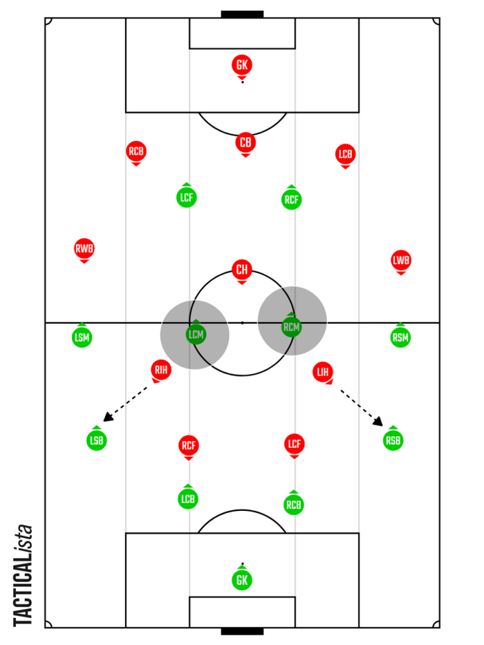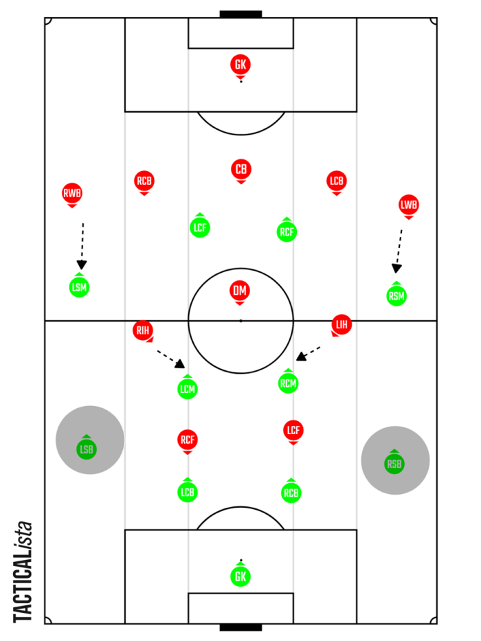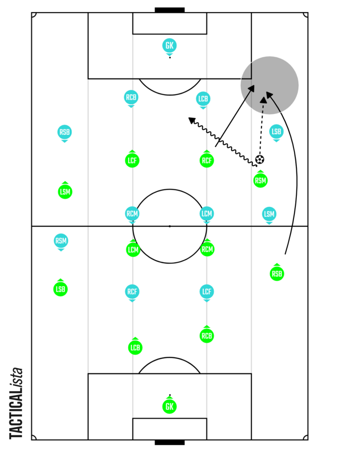 ミラーゲームなる可能性もあるので攻略するには下図のようにSBのオーバーラップやCFがサイドに移動することによってSHが中にドリブルしゴールシーンを演出できるかもしれません。