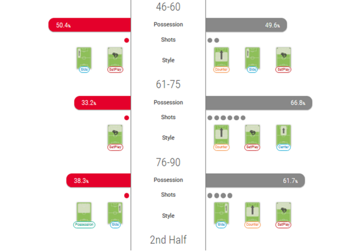 特に後半61分~75分ではボール支配率66.8%、シュート6本と猛攻を仕掛けています。