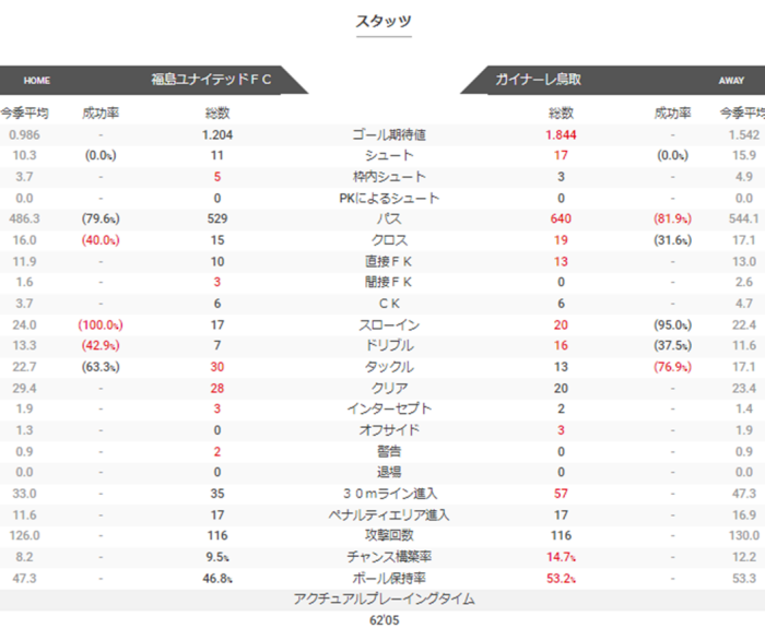 フットボールラボからの引用したスタッツによると攻撃回数が両チーム同数となっており、ゴール期待値、パス、30mライン進入、チャンス構築率が鳥取が上回っています。