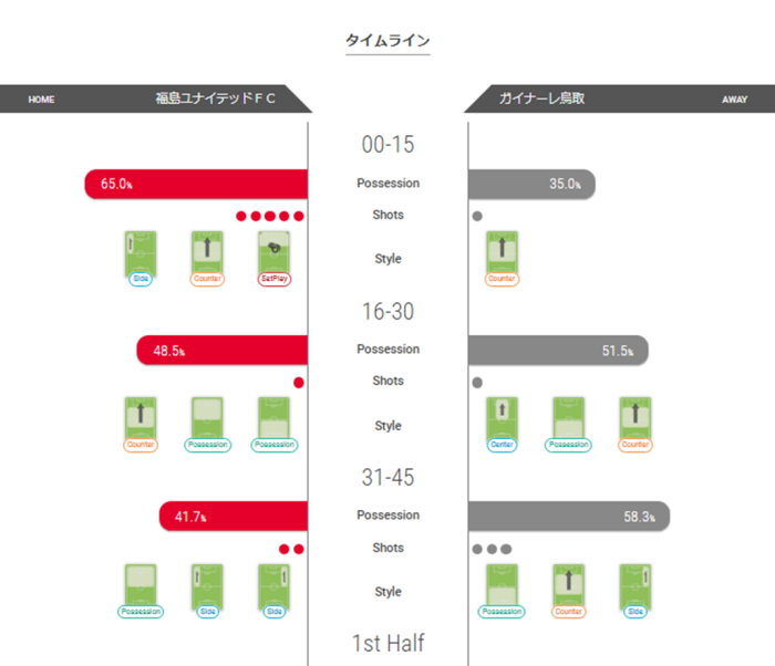 ですが試合は前半は鳥取が防戦一方でした。フットボールラボからのタイムラインを引用すると前半開始から15分までで福島がボール支配率65%、シュート5本を打っています。