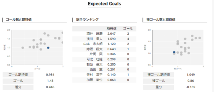 ゴール数では浅川選手が期待値1.590に対して4ゴールを挙げています。