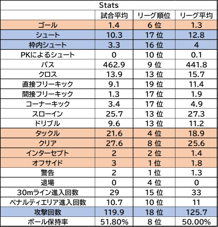フットボールラボから引用したここまでのチームスタッツです。攻撃回数、シュート、枠内シュートは低いですがゴールはリーグ6位の1.4と効率が良いです。