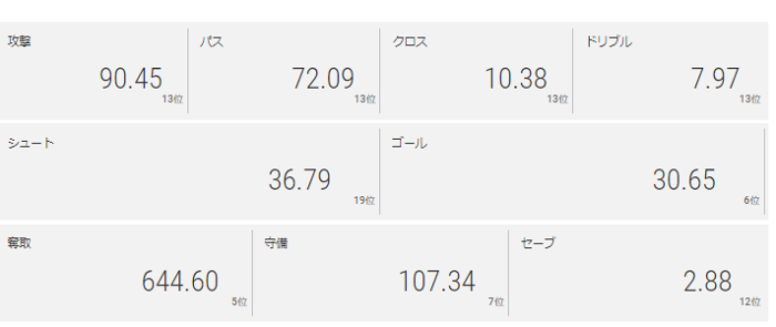 チャンスビルディングポイントも攻撃の数値は低いですが、シュートはリーグ6位で逆に奪取ポイントはリーグ5位、守備ポイントは7位となっています。