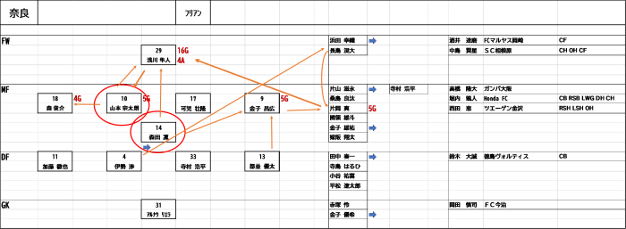 スタメン予想ですが奈良クラブは昨シーズンJ2だった琉球、岩手に2連勝しており大きな変更は無いと考えます。可能性としては左WGに西田選手、右SBに寺村選手の可能性はあるかもしれません。