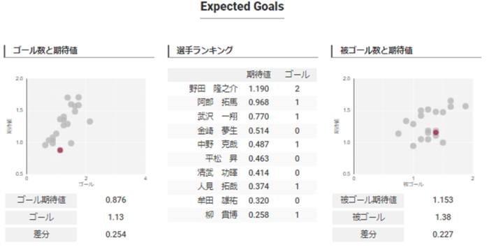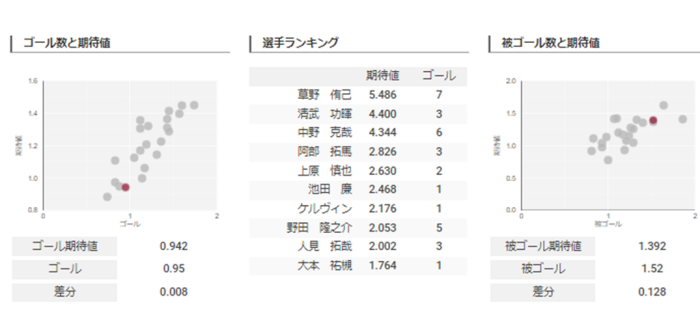 昨シーズンも今シーズンもゴール期待値は1.0を切っています。またゴール期待値<被ゴール期待値となっています。昨シーズンチーム内得点王の草野選手は移籍しており攻撃の中心が不在です。