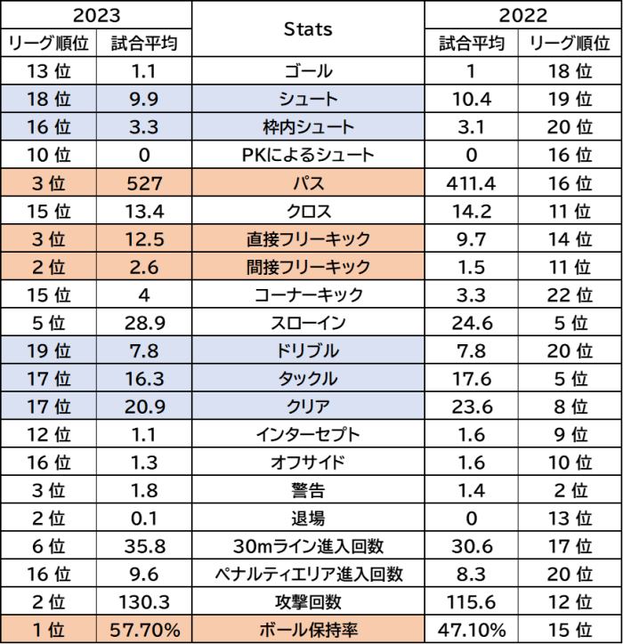 またパスはリーグ3位、フリーキックもリーグ2位、3位と上位ですがシュートはリーグ18位、枠内シュートは16位とゴールに結びついていません。またタックル数が17.6→16.3、クリア数が23.6→20.9と低下しています。