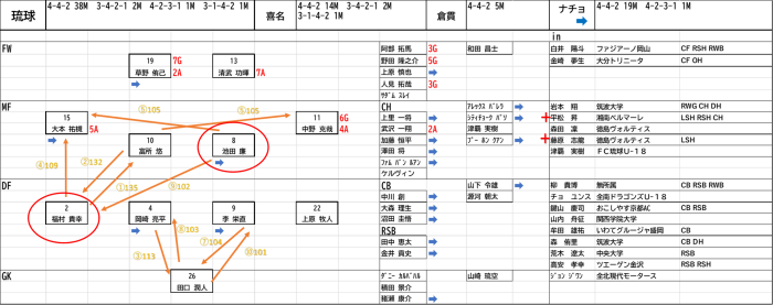 選手の変更も考えられますがCBを昨シーズンSBで起用していた福村選手と上原選手が担い、CBとして開幕より4/1まで起用していた牟田選手、森選手はベンチ外となっています。
