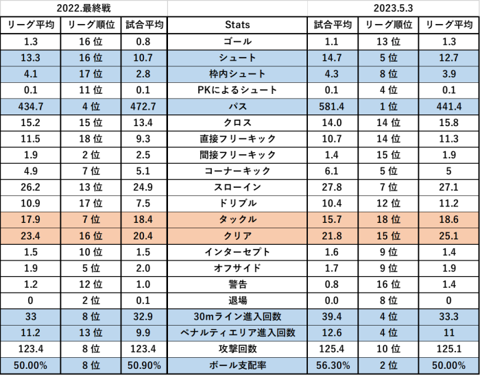 しかしタックル数は低下しており、クリア数もリーグ下位に沈んでいることから守備についてはまだまだ十分に成熟されていないのかもしれません。