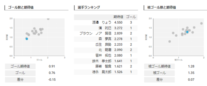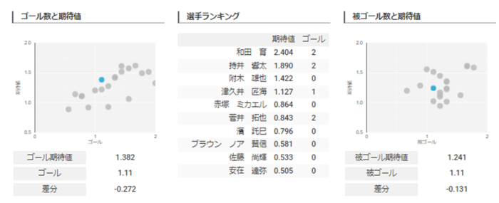 また下図もフットボールラボから引用したゴール期待値とゴールなどです。