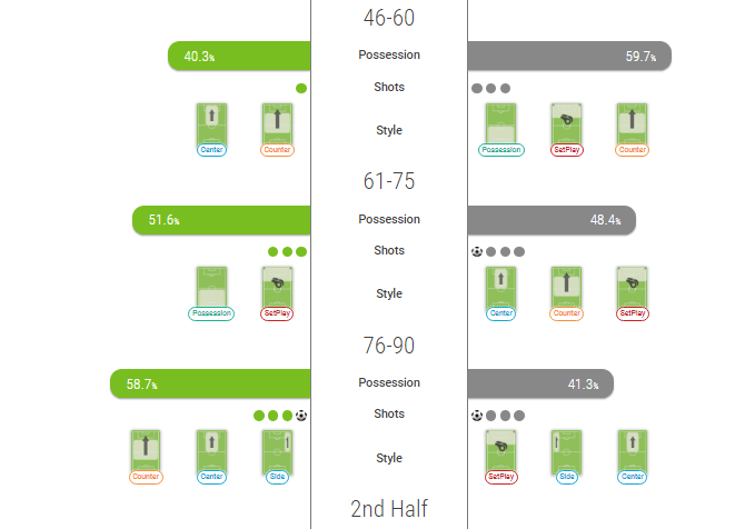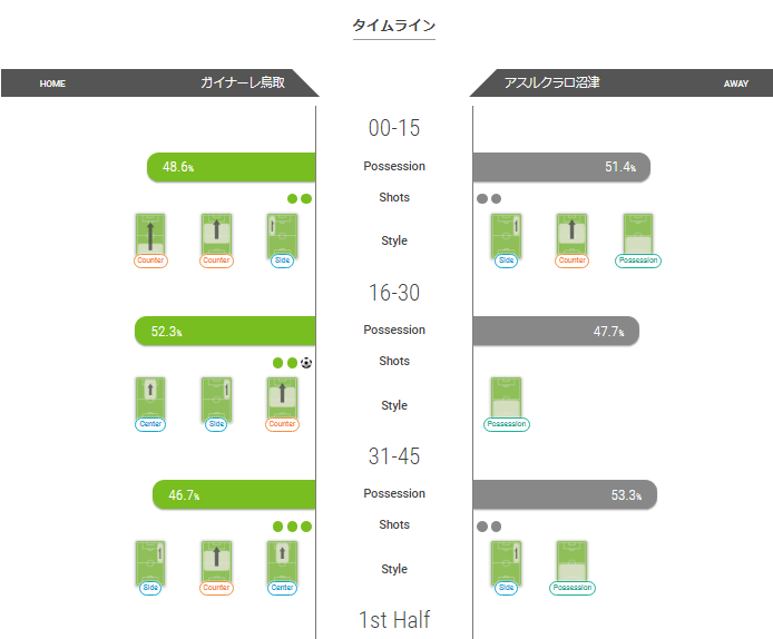 ポゼッションは沼津は最初の15分間にに6割、鳥取は最後の15分間に6割と対称的になりました。
