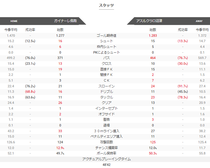 シュートは互角ながらクリアは26本対13本と鳥取が防戦していたことがわかります。