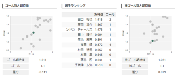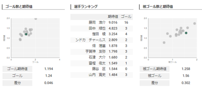 ゴール期待値とゴールでは昨シーズン藤岡選手が期待値9.01に対し16ゴールを決めています。