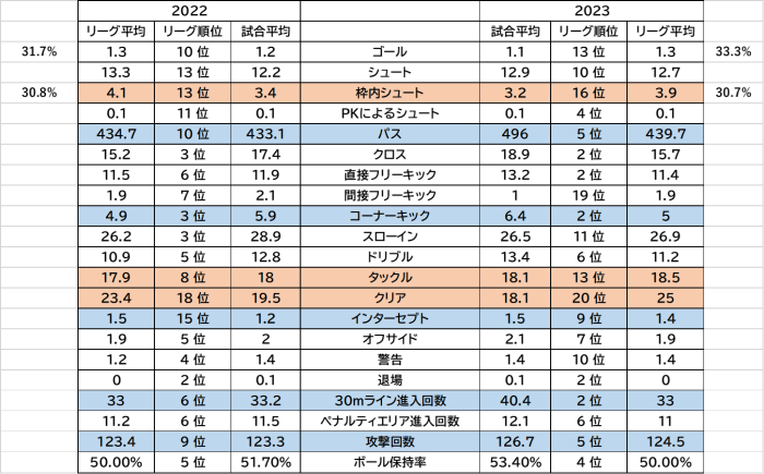 そしてその他のスタッツですが攻撃の数値で高いものはあるも枠内シュートは3.4➡3.2に低下しリーグ16位。守備ではクリア1試合が18.1回とリーグ最下位です。このことからもクリアで十分に守備が回避できていないことがわかります。