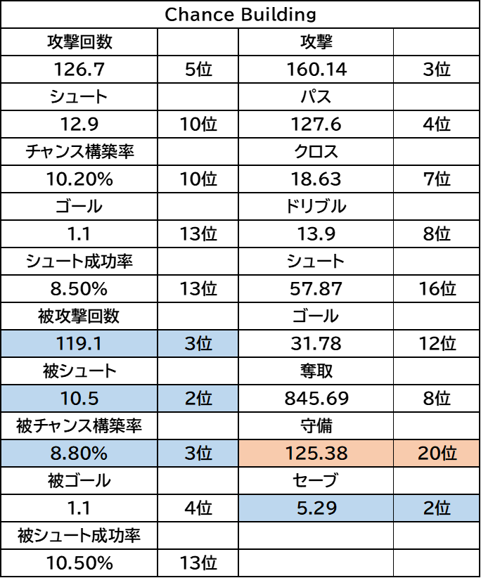 下図はフットボールラボからの引用した今シーズンのスタッツとチャンスビルディングポイントです。