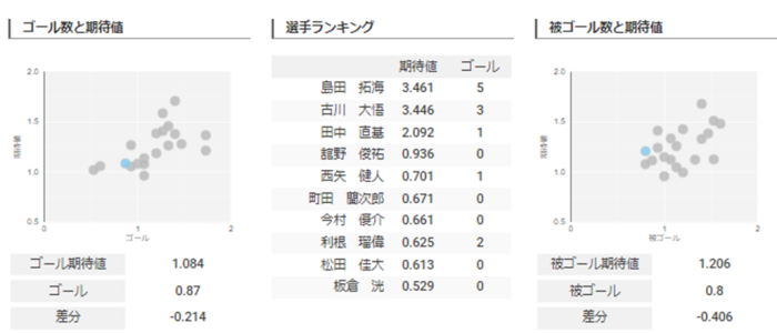 そしてゴールと期待値ですがゴールと被ゴールは両方とも被ゴール期待値ともに下回っていますが1試合での数値はゴール、被ゴールともに0.8で接戦を行っていることが想像できます。