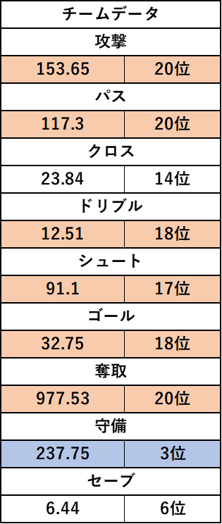 守備は奪取ポイントが20位ですが、攻撃回数、被ゴール。被シュート、守備ポイントが上位を占めています。このことから守備力で少ない点数を守っていることがわかります。