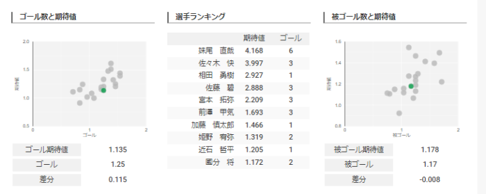 そしてゴールと期待値ですが元ガイナーレの妹尾選手選手が鳥取戦のゴールを含めチーム内トップの6点を挙げています。特に直近5試合で3得点と好調です。