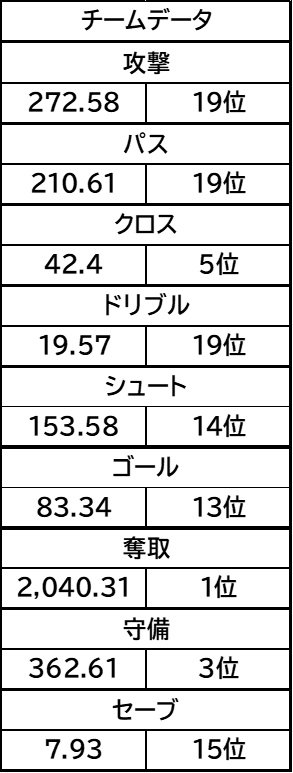 そしてスタッツです。ゴール、シュート、枠内シュートなどの攻撃面とタックル、クリアなどの守備面で数値もですがリグ内順位が上がっているのがわかります。