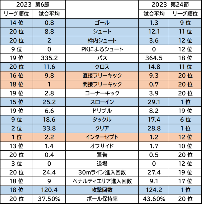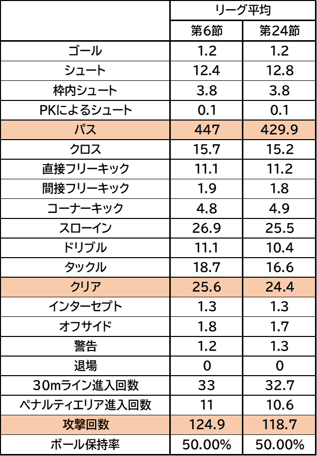 そこで気になるリーグ平均ですがゴールなどは変わっていないのですが、パス、クリア、攻撃回数が減少しています。これは少ない攻撃で確実に攻めるという各チームの思惑があるためではないかと考えますがどうでしょうか?
