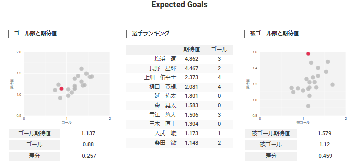 ゴール期待値とゴールですが上畑選手や樋口選手が期待値を上回るゴールをあげていますが個人的には前々節、とその前ゴールした柴田選手です。