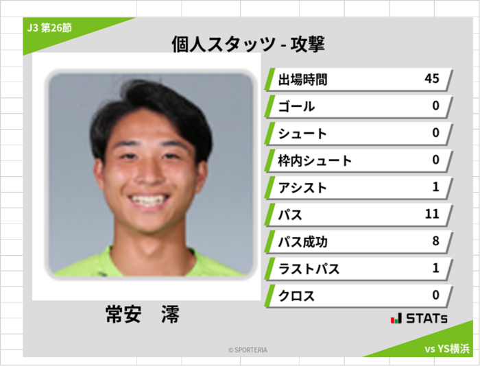 初スタメン、初アシストの常安選手。落ち着きのある球持ちの良いプレーはベテランと勘違いするくらいでした。今節も出場に期待がかかります。