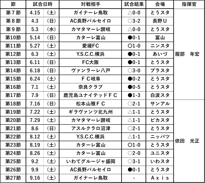 なかなか勝てない試合が続き第18節監督が服部監督から依田監督に交代となりました。