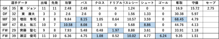 そしてGKの東選手。加入後すぐ先発し11試合で12失点、1.09点と安定しています。