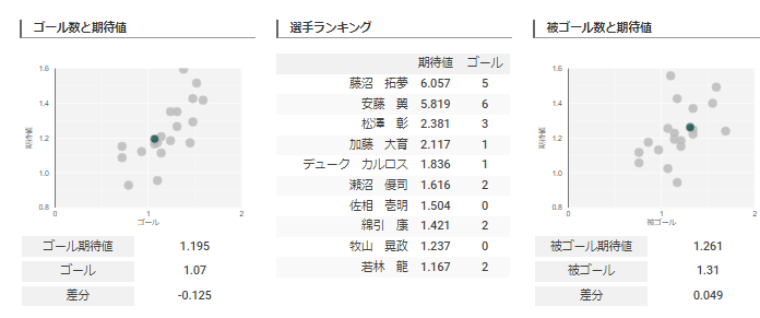 ゴールと期待値ですが、期待値が一番高い藤沼選手が故障中その代わりに安藤選手や瀬沼選手がゴールを挙げています。
