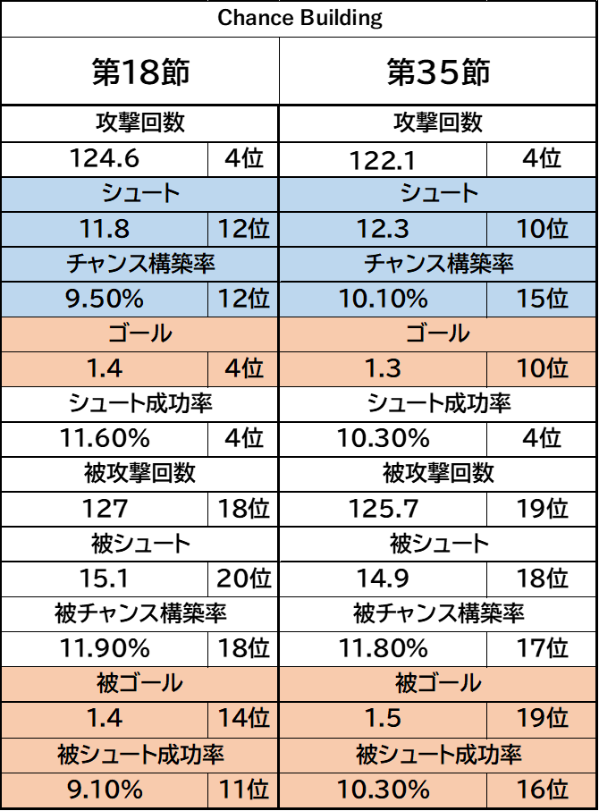こちらのスタッツですがシュート、チャンス構築率は向上していますがゴール、被ゴール、披シュート成功率が低下しておりなかなか勝てない状況になっています。