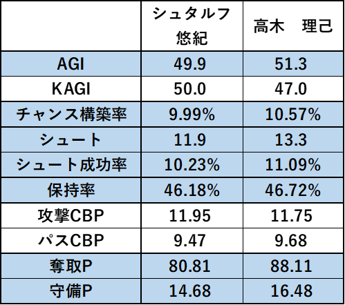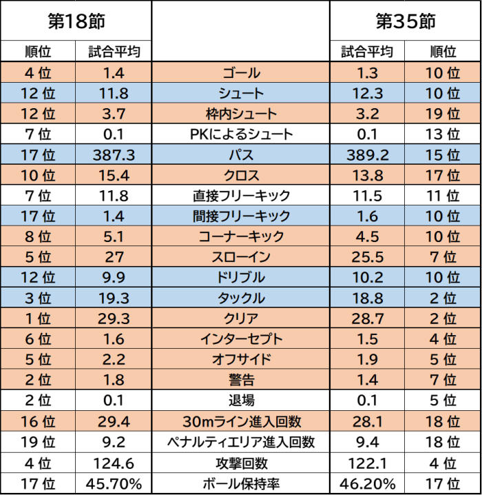 対戦節でのスタッツの比較ではシュートの微量の向上はあるもののクロスが低下しています。