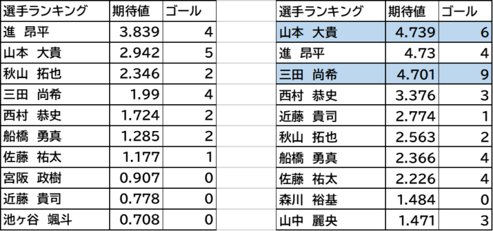 ゴールと期待値ですが三田選手が期待値を上回る9ゴールをあげています。そして山本選手も6ゴールあげています。
