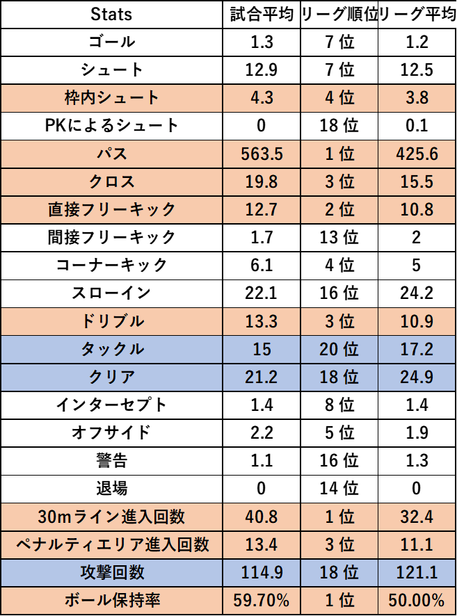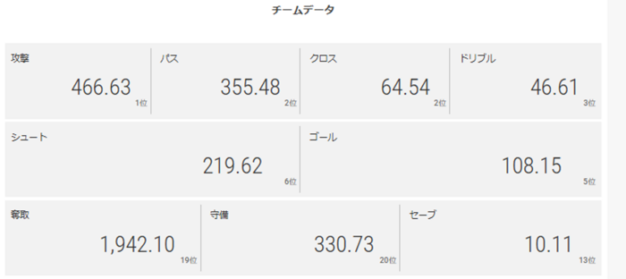 様々なスタッツでは被攻撃回数がリーグ1位と少ない攻撃に抑えていますが被ゴールと被シュート成功率が高くシュートまで持ち込まれると失点する傾向にあります