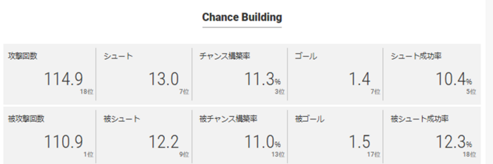 またチームのチャンスビルディングデータは攻撃のパス、クロスでは高く守備の奪取、守備では低くなっています